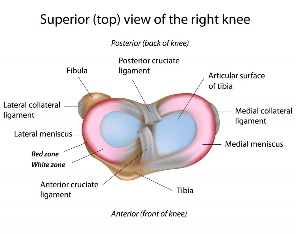 In this image we are looking down at the top of the knee and seeing what sits on top of the shin bone. On this knee’s right side is the medical collateral ligament next to the medical meniscus. To this knee’s left is the lateral meniscus and next to it is the lateral collateral ligament. We also see the red and white zones.